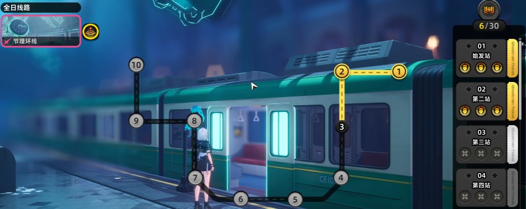 在轨外之境中,玩家需乘坐电车依次挑战 10 个站点,即 10 个独立关卡。每完成一关并达成完美条件,即可获得 3 枚猫头鹰徽章及关卡专属奖励。