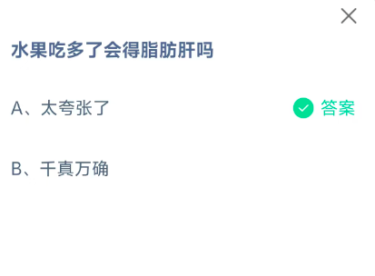 水果吃多了会得脂肪肝吗?这是今天《支付宝》每日一题的问题,相信我们很多用户都很想知道这个问题的答案是什么?这么一个可以领取饲料的机会相信我们很多用户都不想错过,这里指玩手游网的小编为你带来了2025《支付宝》11月5日每日一题最新答案介绍(1)的全部内容,喜欢的小伙伴欢迎点击进入看看吧。
