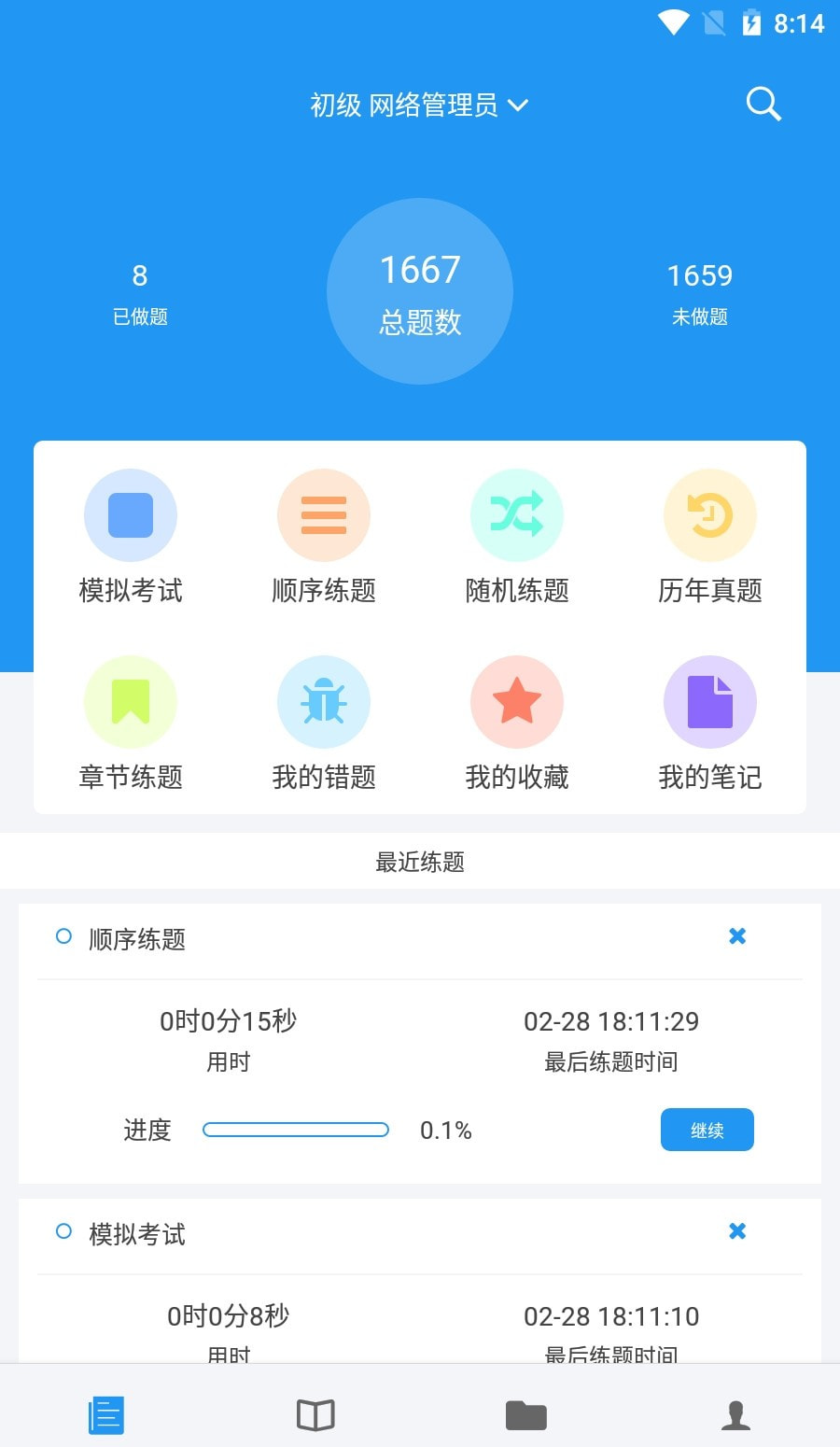 3、在“练题”页面,既可以按分类练习题目,也可以进行模拟考试,同时还有历年真题供大家检测学习水平。