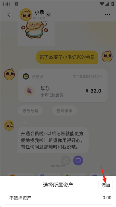 6、在聊天记录中输入支出、收入、资产和花费内容,系统会自动帮你完成记账,非常方便。