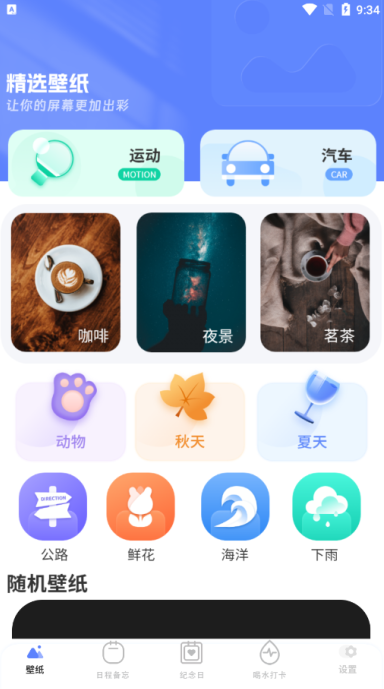 1、锁屏壁纸王软件将壁纸资源分为动物、汽车和风景等不同类别。