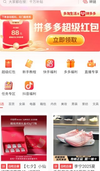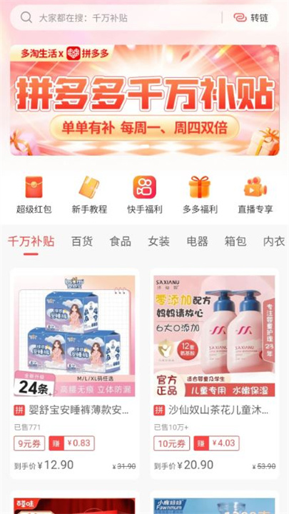 多淘生活让我们所有小伙伴都可以在这里轻松快速的进行网购,海量的最新商品都可以超值省钱购物,涵盖的商品分类也是非常丰富,同时还有着海量的商品优惠券可以免费领取,让我们能够更加省钱的购物,同时还能够根据我们所有用户的日常购物历史,推送更多超值的商品资源,每一款商品的质量也都完全有保证哦,喜欢的小伙伴欢迎点击下载下来吧。