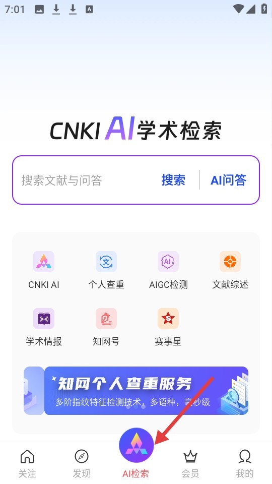 3、AI学术检索界面提供文献搜索和AI问答入口,同时列出了多项学术服务,其中知网个人查重服务尤为突出,底部导航栏包含AI检索等常用选项,便于快速访问。