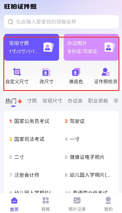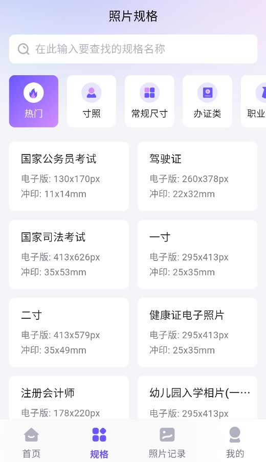 3、在规格选择区,介绍了公务员考试、驾照等常用身份证件照片的尺寸要求。