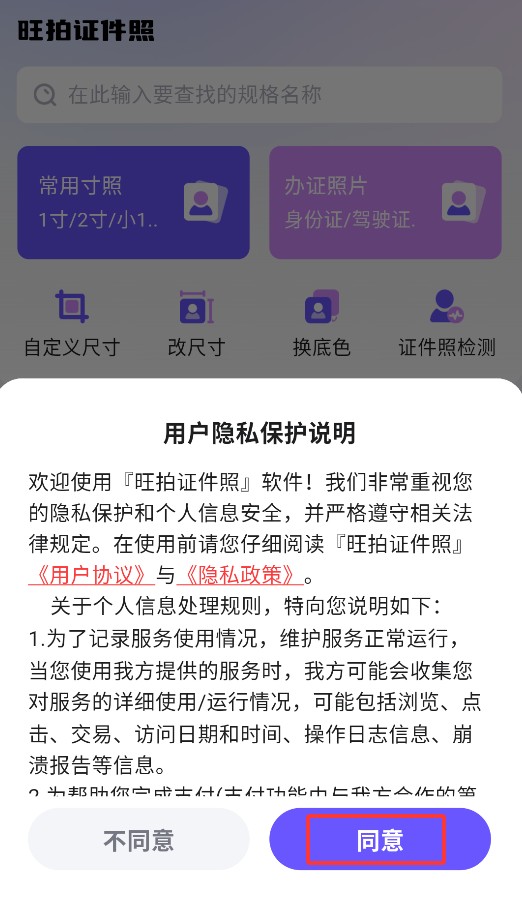 1、当旺拍证件照程序第一次启动时,将显示隐私声明窗口。点击“确认”后,您将进入ID照片创建平台。