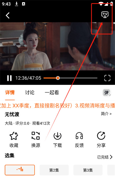 3、然后进入播放页面,点击电视屏幕投影按钮。