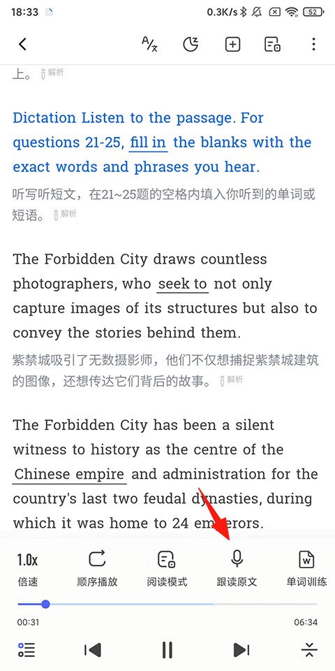 4、支持听众上传自己的资源,并在官网同步高亮字幕,跟着做之后,你可以检查单词发音的准确性,纠正发音问题。