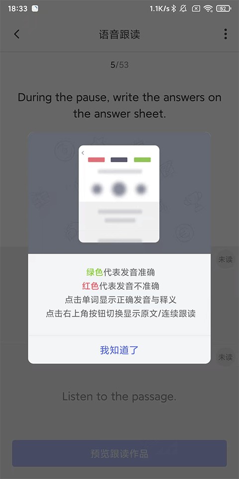 4、系统中绿色表示发音准确,红色表示发音需要改进,点击【我知道了】进行确认;