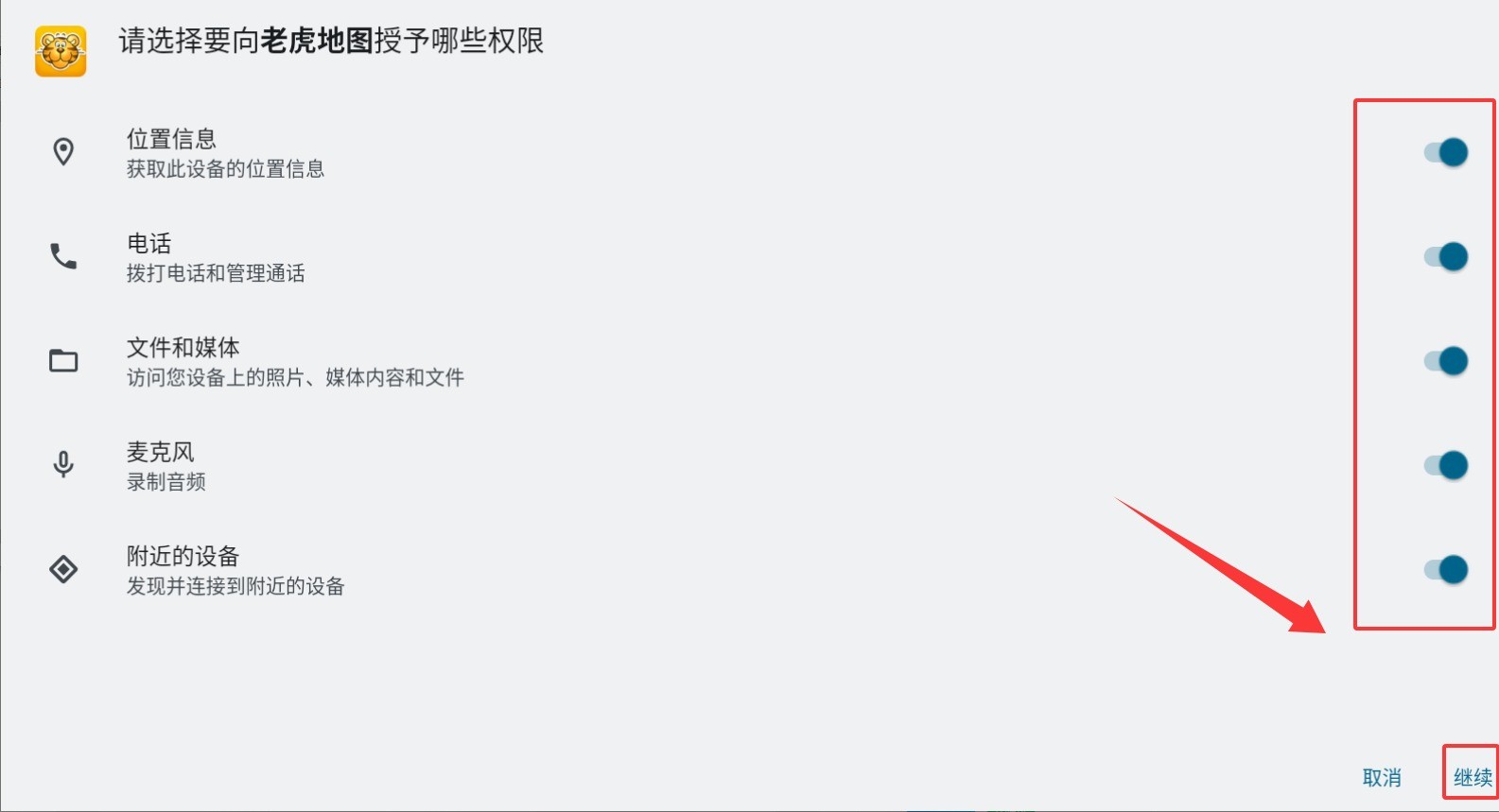 1、首次启动老虎地图应用时,需要开启所有权限并点击继续,以完成基础定位服务的配置流程;