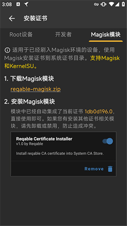 3、如果用户不希望对设备进行root,官方也提供了通过Magisk模块管理器来完成证书安装的方法,具体操作步骤同样可以在App中查看。