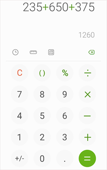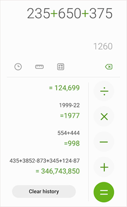 三星计算器支持大数运算,最高可达200位以上,并可进行加、减、乘、除运算,挑战操作的极限,同步升级,提供更多的计算功能,是日常生活中完美的帮手,利率是自动更新的,货币可以在中间自由兑换,在计算工资领取个人收入时,五险一金缴纳数额一目了然,点击计算结果,选择将其转换为中文大写字母,使费用报销更加方便,计算结果在整个计算过程中随时随地显示,如果在计算过程中发现任何输入错误,应在不影响当前计算的情况下立即更改。