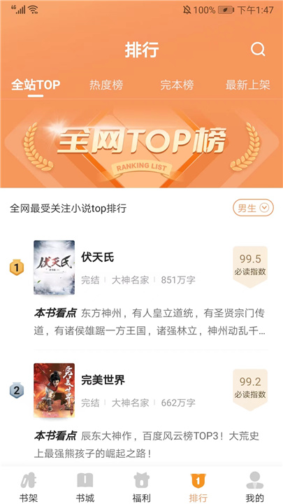 7、进入【排行】界面,包含【全站TOP】、【热度榜】、【完本榜】和【最新上架】四大排行榜,用户可根据兴趣选择并阅读热门书籍;