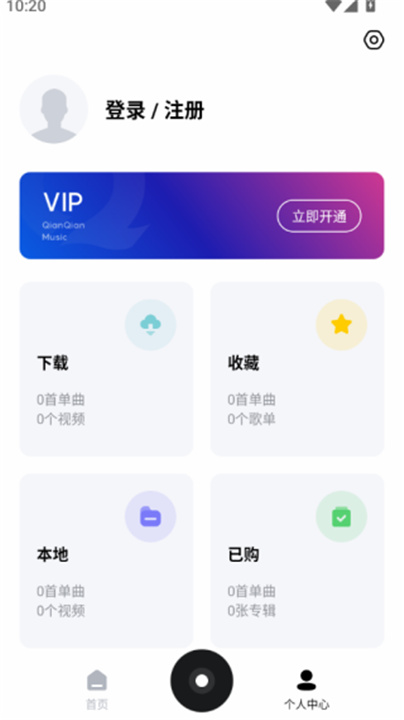 4、返回首页后,点击“我的”栏目,可以进行登录或注册,同时提供下载管理、收藏夹、本地音乐和已购音乐等服务。
