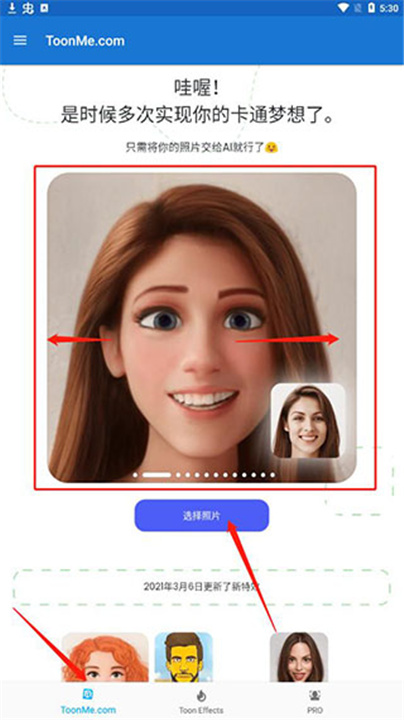 1、成功下载安装toonme后,打开应用,在首页可以左右滑动浏览,选择自己喜欢的ToonMe特效,然后挑选一张照片进行处理;