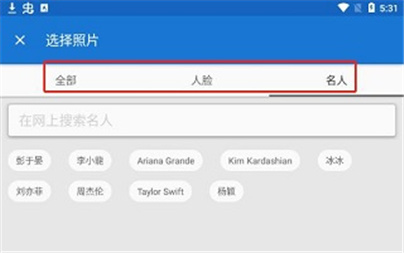 2、你可以在“全部”中选择照片,也可以从自动识别的人脸中挑选,还可以选择名人或明星照片进行尝试;