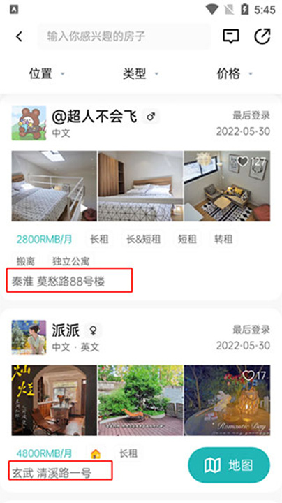 3、选择好城市后,就能看到该城市当前正在出租的房源,并且在列表中可以查看每个房子的具体位置。