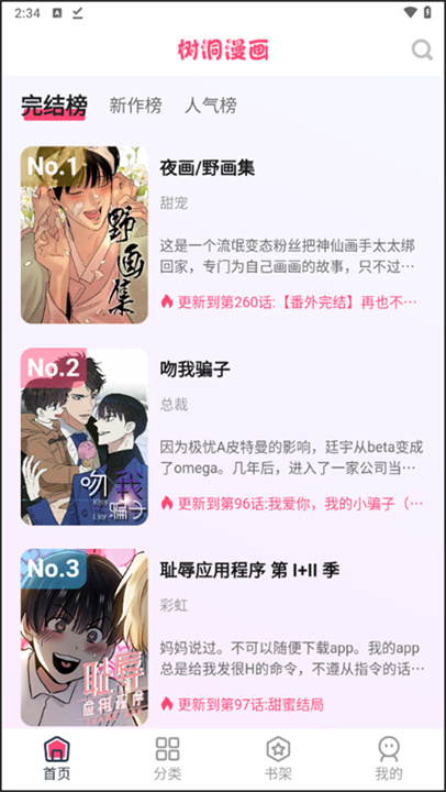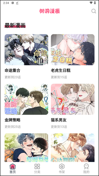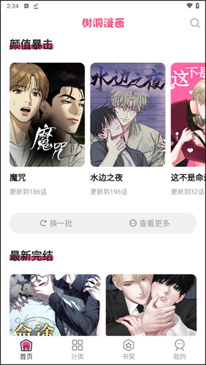 1、在树洞漫画软件首页,你可以看到更新、分类、榜单、收藏等多个板块,方便快速浏览内容。