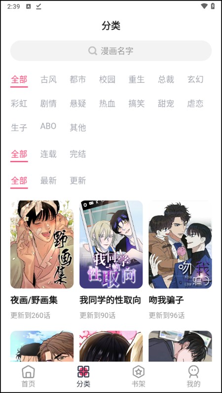 2、在分类页面里,可以根据古风、都市、校园、重生、总裁、玄幻、彩虹、剧情等多种类型,筛选出自己喜欢的漫画。