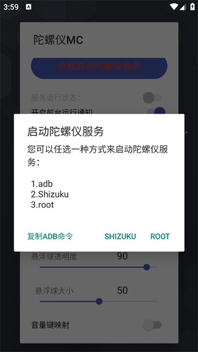 1、陀螺仪MC需要选择一种运行方式,可以使用手机root、shizuku或者ADB,这里优先推荐使用shizuku;shizuku的下载方式可以参考特别说明。