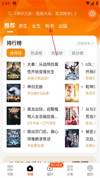 1、打开琅阅,进入书城页面后,点击“听书”,进入听书专区。