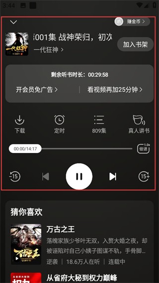 3、在《一代狂神》详情页,点击“立即收听”,即可开始播放书籍内容。