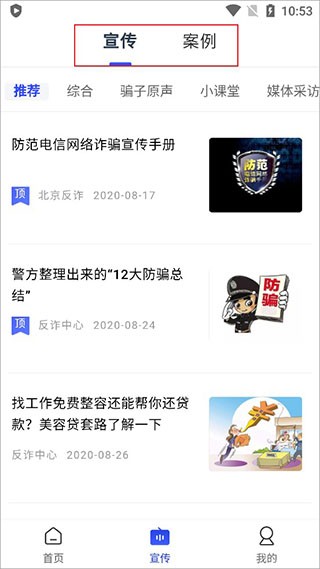 4、切换到“宣传”板块,就可以看到各种诈骗相关的信息和真实案例;