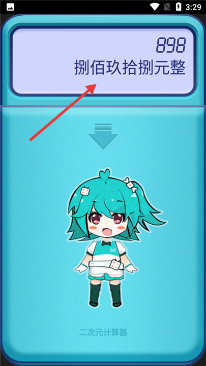 2、图二显示了大写转换的结果,输入的数字898被转换为“捌佰玖拾捌元整”,界面下方还配有一位可爱的二次元角色形象。