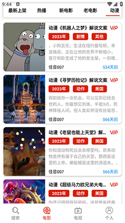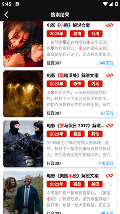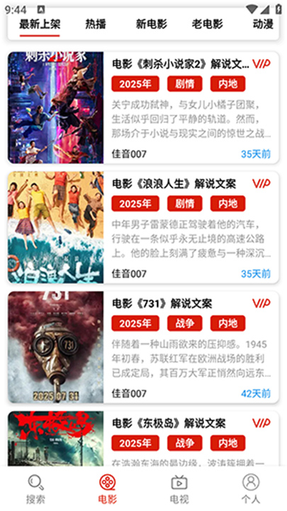1、佳音文案解说App上会展示很多热门影片的解说内容,直接滑一滑就能看到。