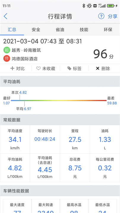 2、通过算法计算油耗变化,显示因加速方式、怠速持续时间、驾驶习惯导致的油耗差异,帮助用户寻找更节能的驾驶方式。