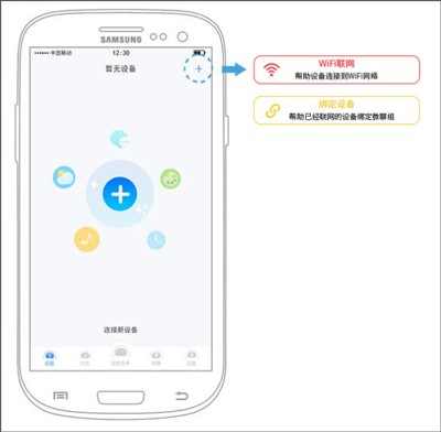 第一步:根据说明书的指引,将设备设置为联网状态,随后根据设备发出的语音提示,进入APP中的设备页面,点击右上角的【+】号按钮,选择设备的上网设置进行联网操作。
