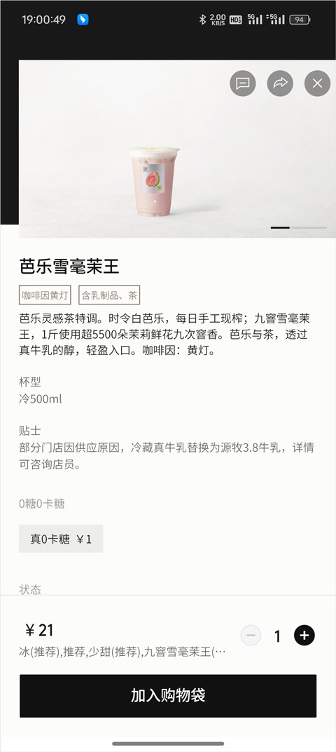 3、进入所选奶茶的详情页,选择规格和加料后,点击“加入购物袋”。