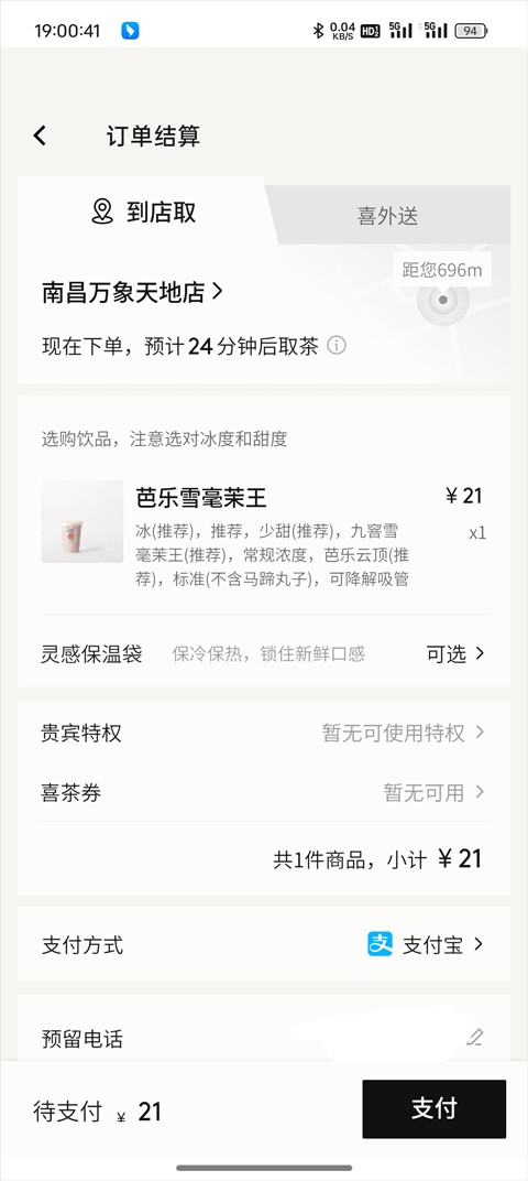 4、返回购物袋页面,点击“结算”,完成支付后记住系统提供的取货码,等待饮品制作完成即可到店取货。