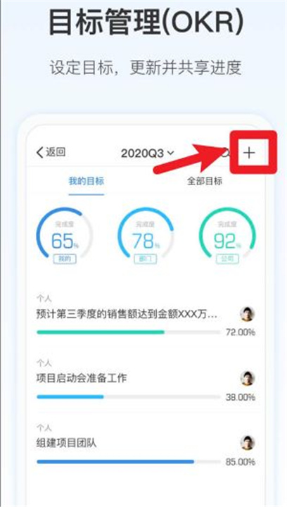 1、在Worktile目标管理界面,点击右上角的“加号”按钮即可新增季度目标,填写完成后,系统会自动记录并显示目标的完成进度。