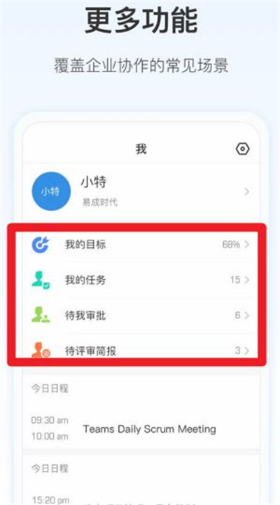 3、在“我”页面中,可以查看自己的任务、日程安排、审批事项等内容,操作简单直观,非常适合企业日常协作和管理。