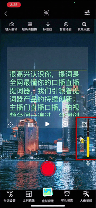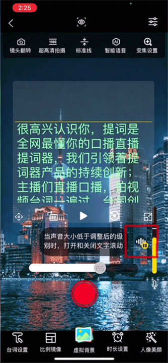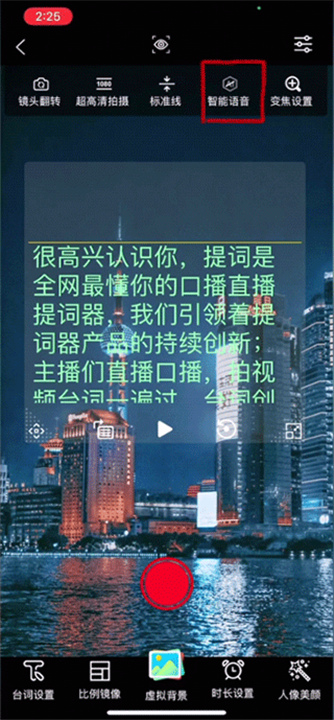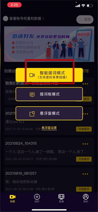 2、在【拍摄】页面找到一个需要的台词,然后点击“开始提词”,并选择第一个智能提词模式进行使用。