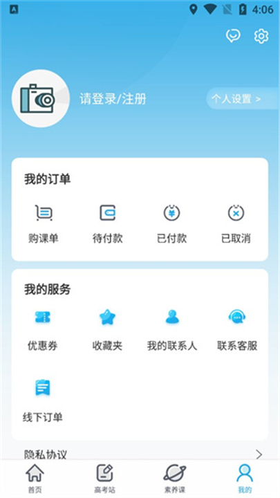 3、点击“我的”,进行登录或注册,管理订单和优惠券,联系客服,设置个人信息,享受完整的教育服务。