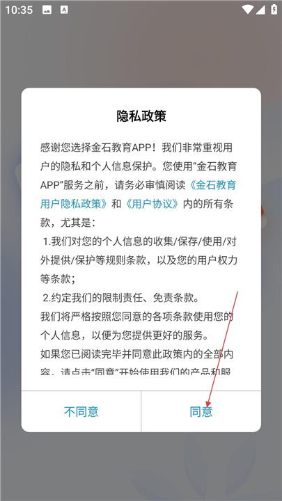 1、打开金石教育,点击同意隐私政策后进入首页,选择素养课程或查询校区,浏览课程内容,了解详细课程信息。