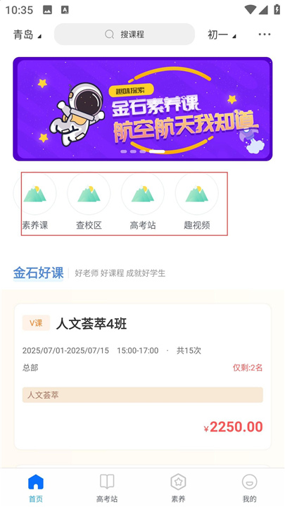 2、在政策页面点击同意,进入主界面,通过搜索功能查找课程,查看金石推荐的优质课程,选择人文荟萃班,了解上课时间和费用详情。