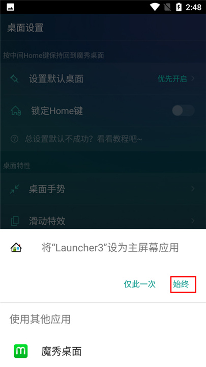 4、点击该选项会弹出设置菜单,选择【魔秀桌面】并点击【设置】即可完成。