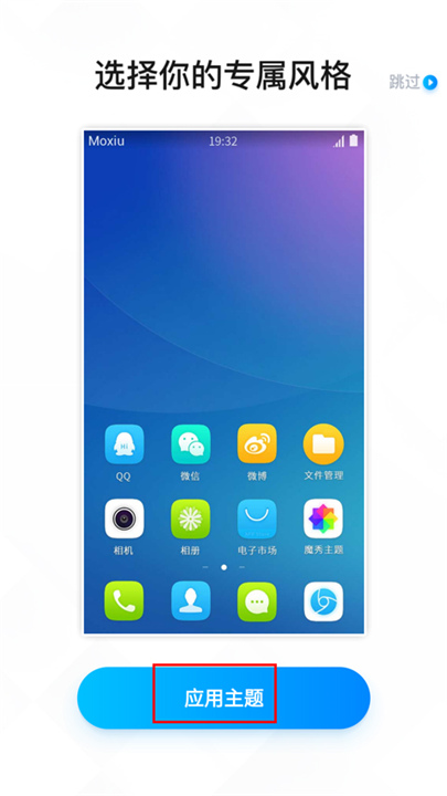 1、在本站下载安装魔秀主题后,滑动浏览并选择喜欢的主题,然后点击中间的【应用主题】;