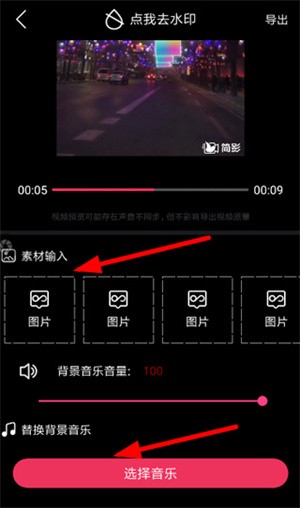 2、接下来,滑动页面到下方,使用“素材输入”功能,添加你手机本地相册中的图片素材,或者替换模板中的背景音乐。