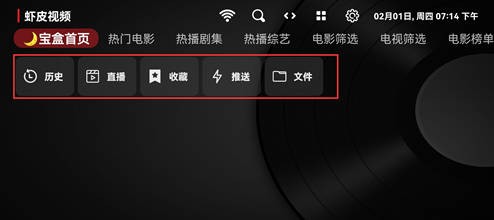 1、在手机上下载安装好虾皮视频软件后,打开进入首页,首页中会展示各种功能栏目,如观看历史、直播、收藏以及推送等;