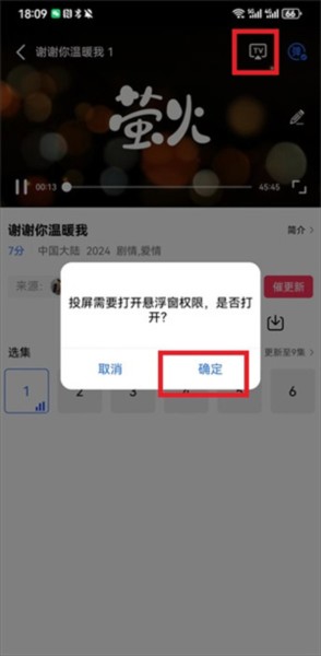 2、在播放界面中点击视频播放区域,就能看到右上角出现一个【tv】标志,点击它即可进行投屏,但此时需要先进行授权,点击【确定】为软件授权;