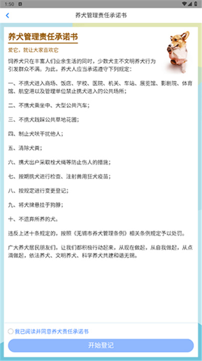 3、阅读并签署《养犬管理责任承诺书》,随后点击【开始登记】继续操作。