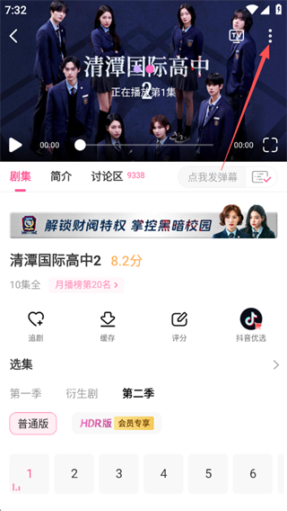 2、在播放页面点击右上角的三个点图标(箭头所指处)。