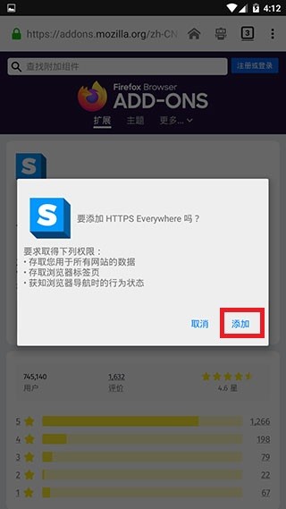 5、点击“添加到Firefox”按钮后,等待下载完成。在弹出的确认框中点击“添加”,稍等片刻,组件就会成功添加到Firefox浏览器中了。