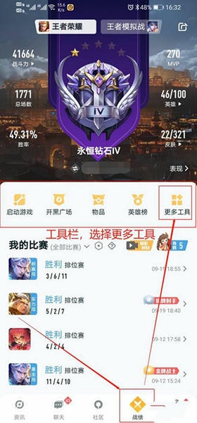 2、将底部导航栏切换到“战绩”页面,你会看到该页面上方有一个工具栏。