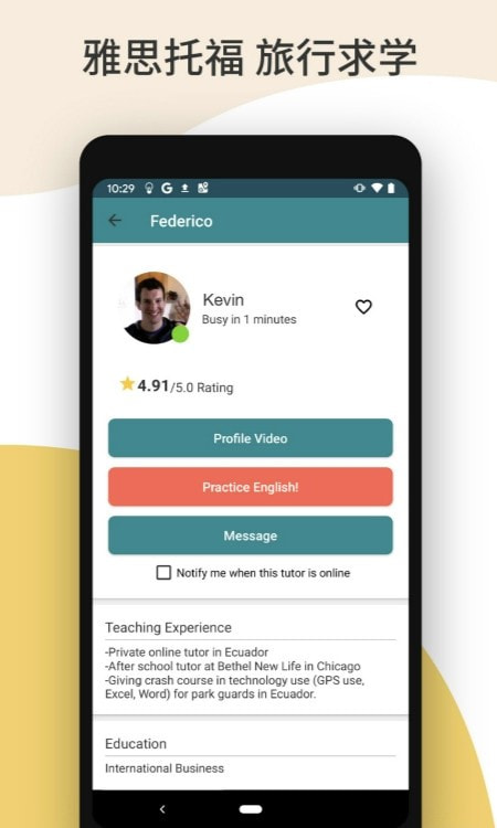 4、可以通过实时视频聊天与以英语为母语的人进行即时对话,这些平易近人的英语私人导师将随时为您提供帮助,帮助您练习会话技巧,发音和其他您想提高的英语技能。