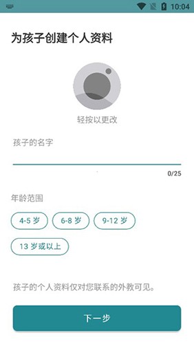 2、接着为孩子创建个人档案,输入名字后点击下一步。