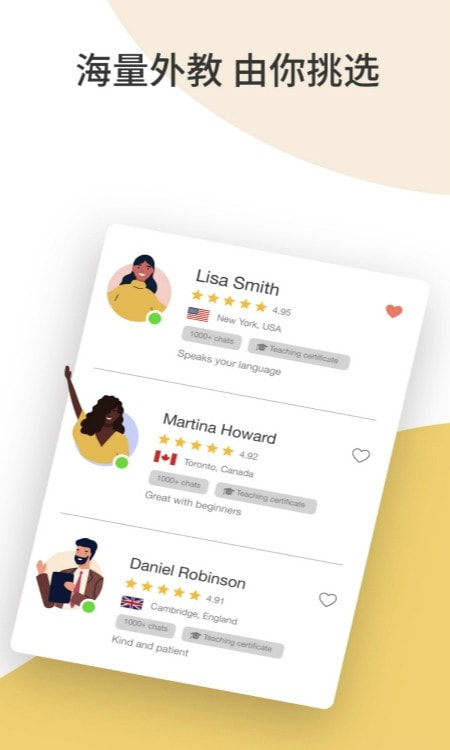 Cambly家教团队包括大学生、教师、商务人士、作家、演员等,每个人都可以在这里找到自己理想的家庭教师,最好保证罗塞塔石碑、多邻国、Busuu、Open English、Livemocha等语言学习软件发挥显著作用,让我们可以学习到更加正规的外语。